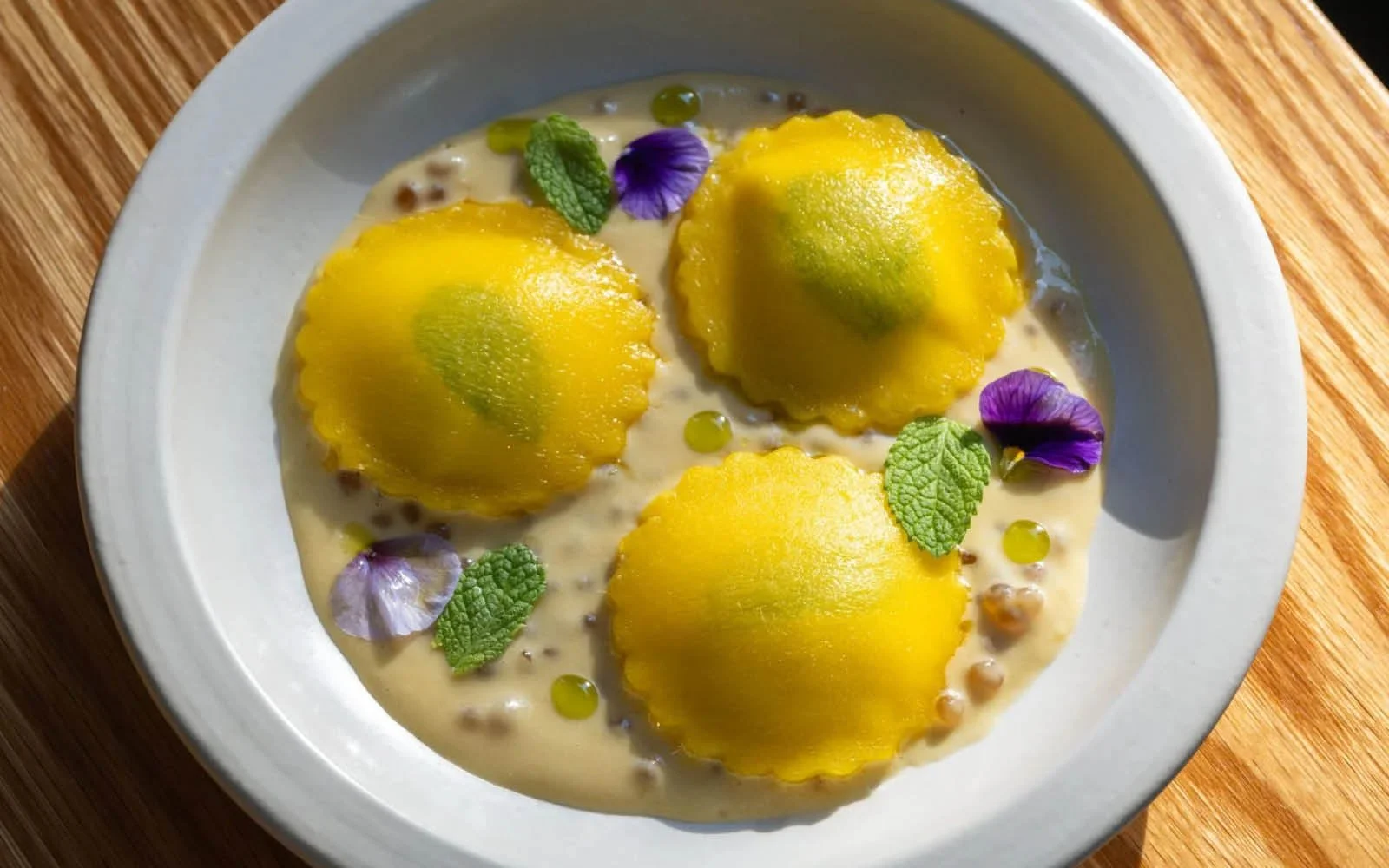 Mango-Peach “Ravioli,” Labneh Filling, Coconut Tapioca, Mango-Peach Compote, Pineapple-Mint Oil